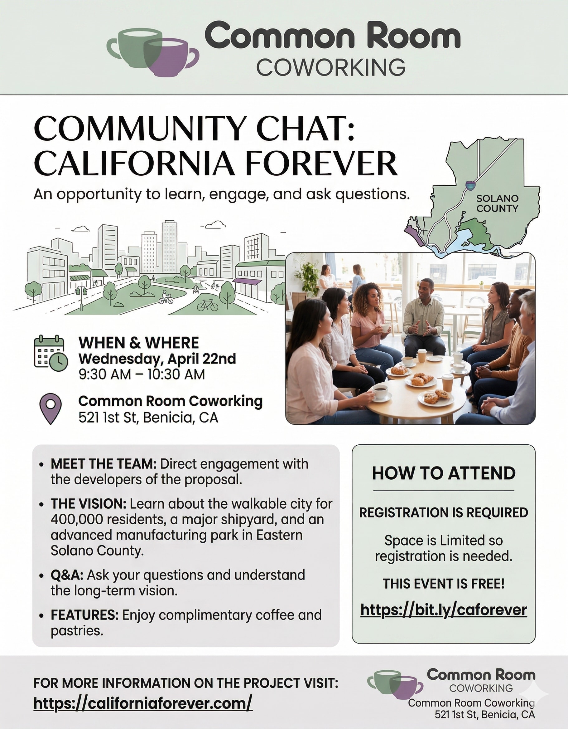 Meet the team of California Forever, the vision and ask your questions. Enjoy Complimentary coffee and pastries. April 22nd 9:30-10:30am at the Common Room 521 First Street, Benicia Registration is required